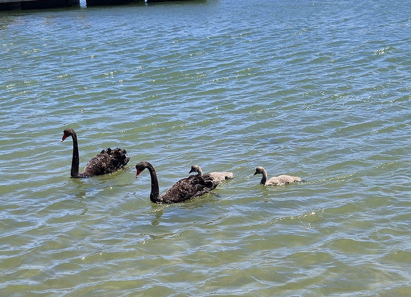After a restorative beverage, I headed off to explore what other points of interest the foreshore had to offer. There wasn’t a great deal to see, really, other than the broad expanse of the inlet and the occasional passing tourist vessel. The ‘beach’, such as it was, did not impress, but the Black Swans and fluffy grey cygnets were an entirely different matter. I noticed several as I rode along, stopping to admire the graceful way their necks arch above their delicately bobbing bodies and the way the seem to move serenely over the top of the water, rather than through it.