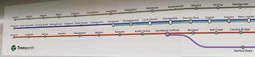 This confused me, since the train Tannoy system had announced very clearly that the train terminated in Mandurah. Squinting in that special way lost travellers have, I eyeballed the line drawing above the windows opposite me. There, in colourful detail, was each of the MetroNet train routes. As the drawing was in minus 500 point text, it took some determined squinting to establish which coloured line I needed to track and then to make sense of the station names. My surprise when I finally located Rockingham – three stops before Mandurah – was profound.** It also went a long way to explain the guards’ confusion – which I had put down to language difficulties, rather than the dealing-with-an-odd-customer difficulties it turned out to be. I guess they had an entertaining story to tell when they got to their morning coffee break!